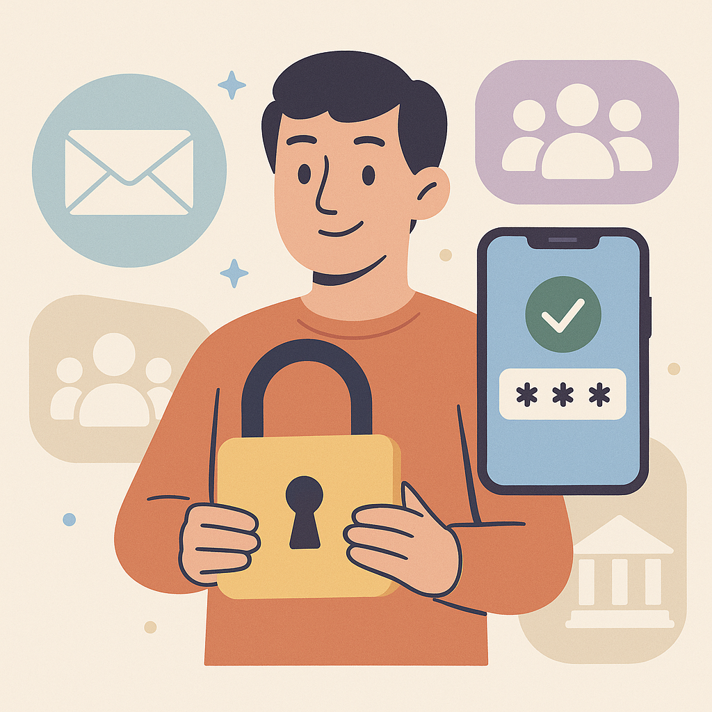 Ative a verificação em duas etapas sempre que puder. Ela pede um segundo código além da senha. Mesmo que alguém descubra sua senha, fica bem mais difícil entrar.
